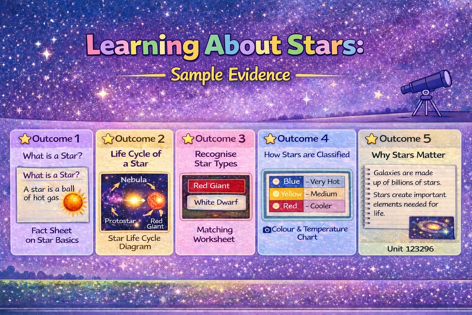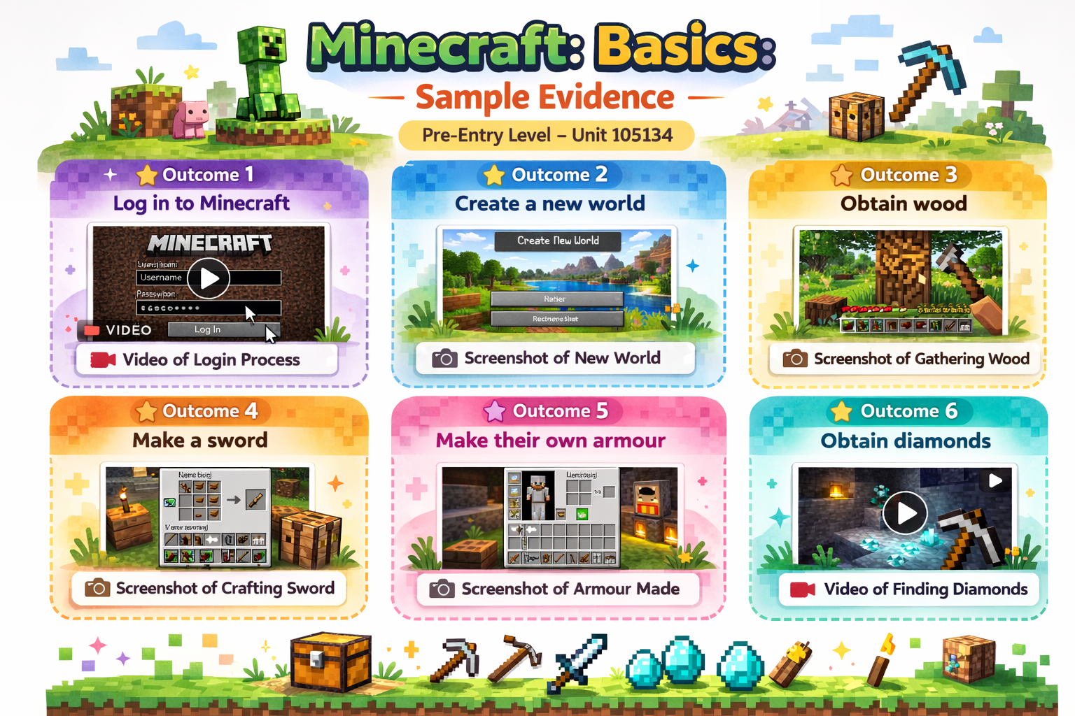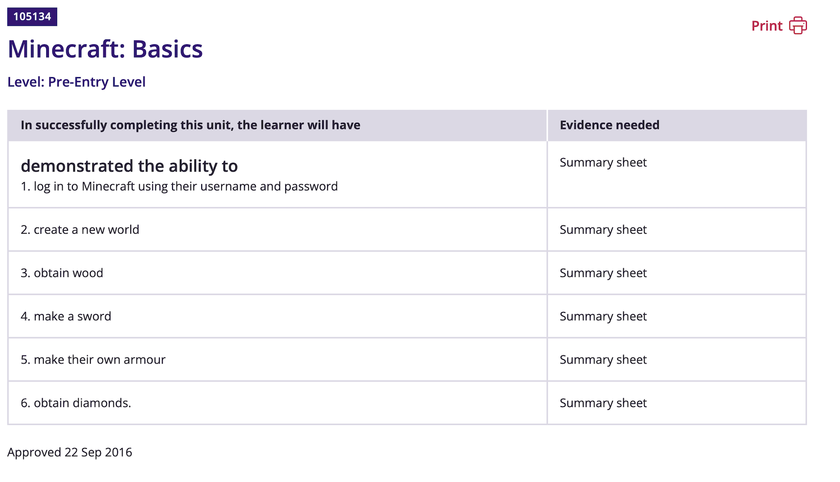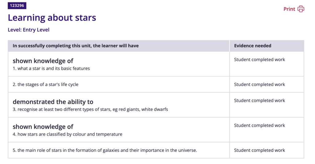 Below you will see two examples. Unit 105134 (Minecraft: Basics) and Unit 123296 (Learning about Stars). You will see on the first one, the evidence needed is a summary sheet (so you can show your child’s work in many different ways) and on the second one, the evidence is ‘student completed work’ (so you’ll need to upload a copy of your child’s written or computer work). In the graphics, you’ll just see a few ideas but you really have got the freedom to complete them however you like.